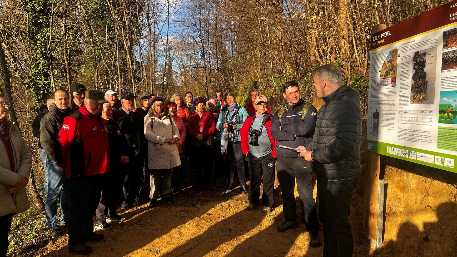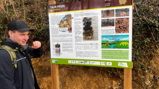 17.marca pa je projekt zaživel tudi na terenu. Peter Horvat, mladi raziskovalec z Oddelka za gozdno ekologijo na GIS, je v Sevnici, ob učni poti Gozd je kultura, ki vodi proti sevniškemu gradu, predstavil novo interpretacijsko tablo o gozdnih tleh. Njena vsebina obiskovalcem na poljuden in razumljiv način približa pomen tal v gozdnem prostoru ter spodbuja k razmisleku o njihovem varovanju. S tem sodelavci projekta SOIL:OIA nadaljujemo z ozaveščanjem javnosti in približevanjem znanstvenih spoznanj širši skupnosti.